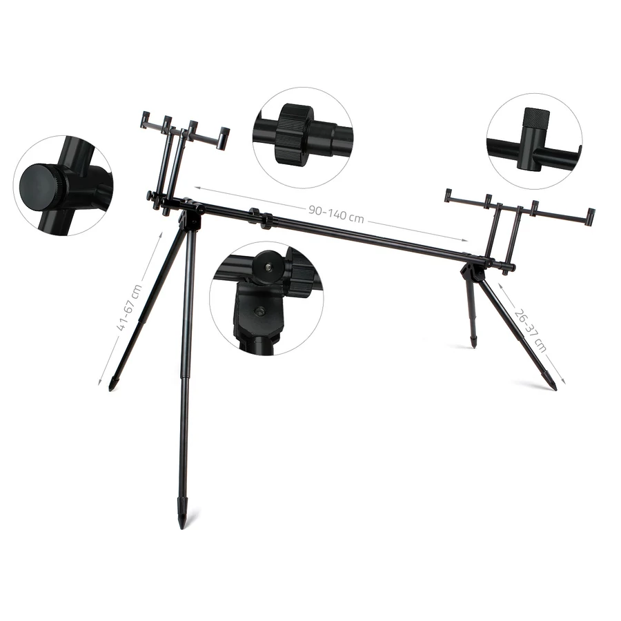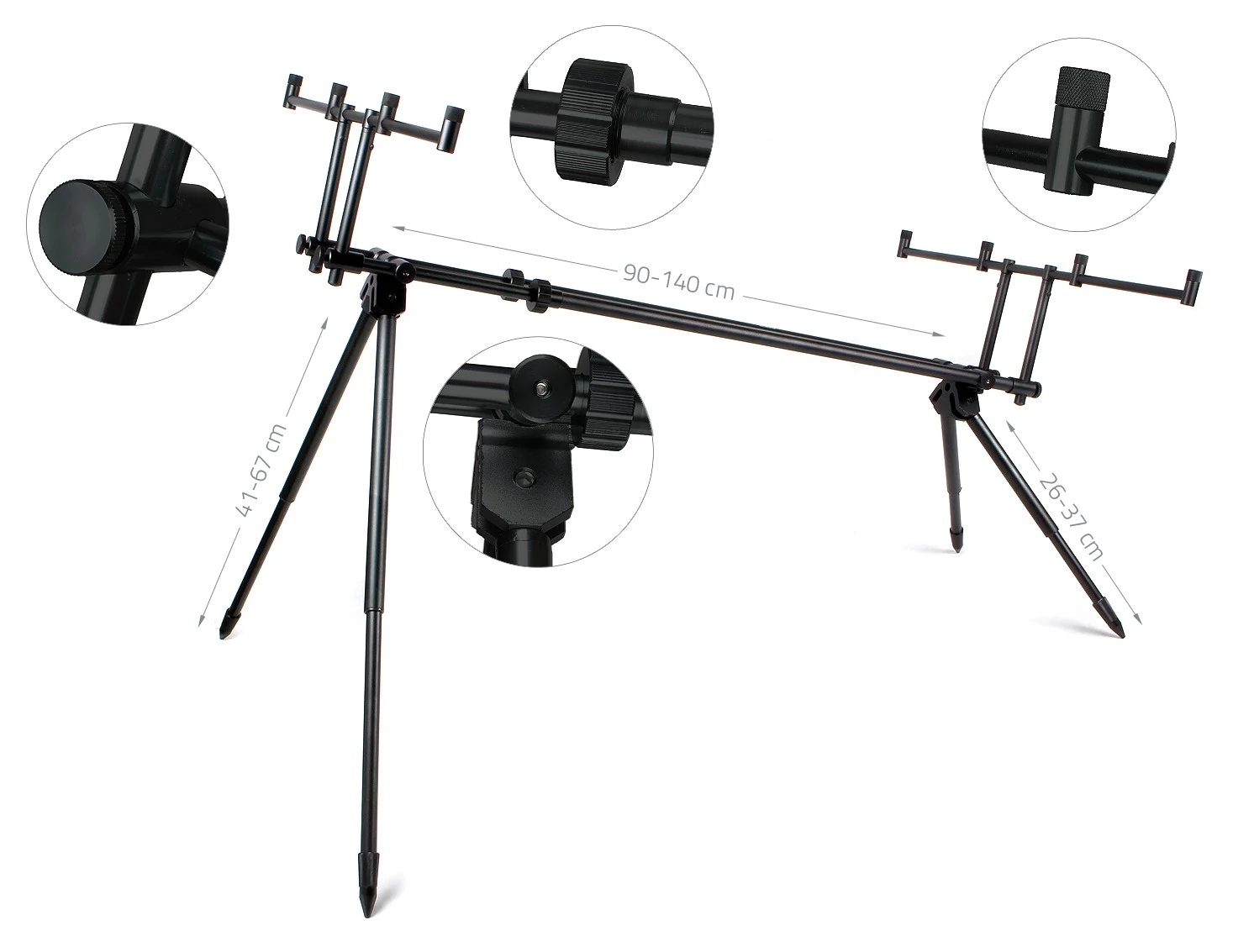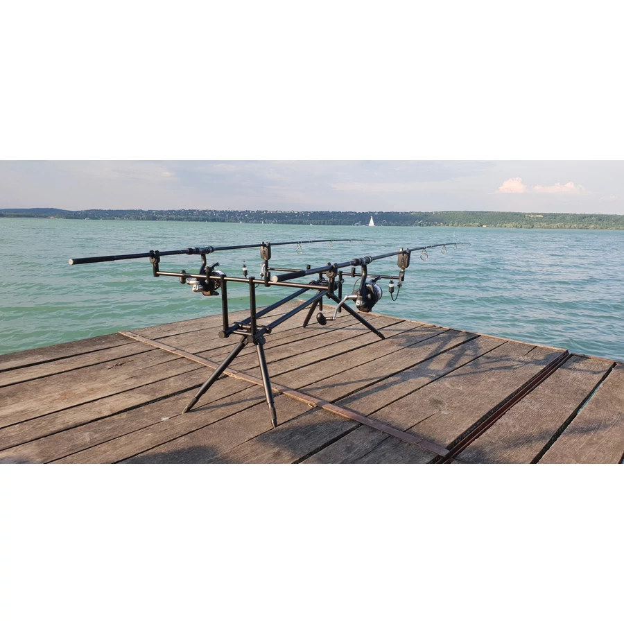 A négybotos kereszttartónak köszönhetően botjainkat tetszés szerinti távolságban helyezhetjük el egymástól. Az önzáró teleszkópos lábak fokozatmentes láb beállítást tesznek lehetővé, illetve az állítható magasságú kereszttartókkal tudjuk a rod pod súlypontját lejjebb vinni, ami nagyon előnyös szeles időben. A kontraanyás kereszttartókon a kapásjelzők és bottartófejek egyszerűen lefixálhatóak a helyes állásba. Párnázott hordozó táska védi a szállitási sérülésektől.