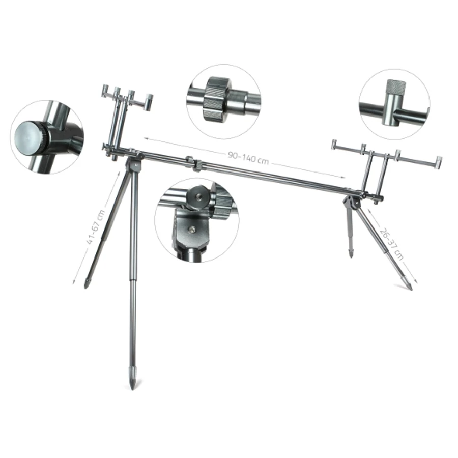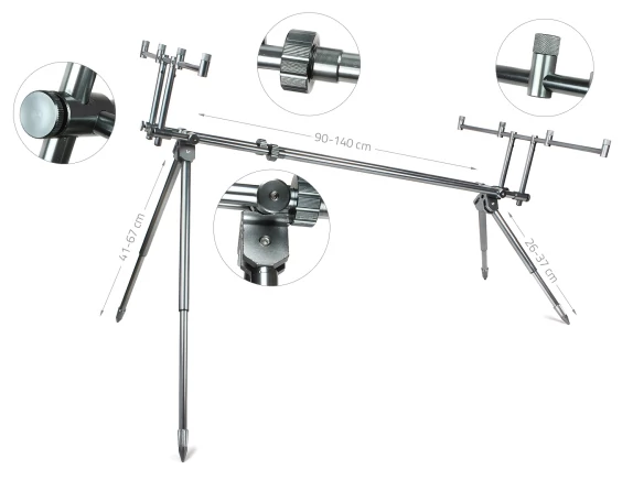 Ezüst színű, elegáns megjelenésű, exkluziv kivitel jellemzi az Alcatraz bottartó állványokat Tiszta fém minden alkatrész, amely garantálja a hosszú élettartamot. A többféle szögben állítható lábak garantálják, hogy bármely terepen biztonsággal fel tudjuk állítani. A masszív csatlakozási pontok rendkívüli stabilitást adnak, még extrém körülmények között is. A négybotos kereszttartónak köszönhetően botjainkat tetszés szerinti távolságban helyezhetjük el egymástól. Az önzáró teleszkópos lábak fokozatmentes láb beállítást tesznek lehetővé, illetve az állítható magasságú kereszttartókkal tudjuk a rod pod súlypontját lejjebb vinni, ami nagyon előnyös szeles időben. A kontraanyás kereszttartókon a kapásjelzők és bottartófejek egyszerűen lefixálhatóak a helyes állásba. Párnázott hordozó táska védi a szállitási sérülésektől.