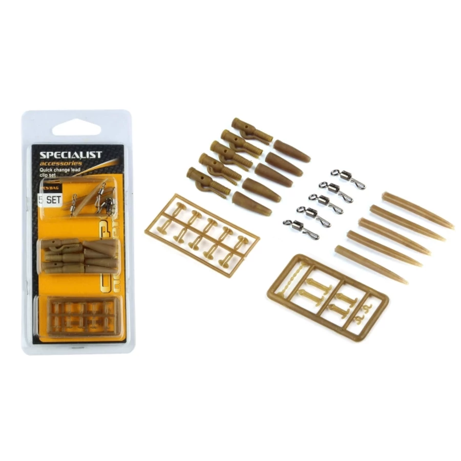 - A készlet tartalmaz biztonsági ólomkapcsokat, gyorskapcsokat az előkéhez, valamint hozzá való gubancgátló szilikoncsöveket. Továbbá öt különböző méretű és típusú stoppert a csalikhoz.