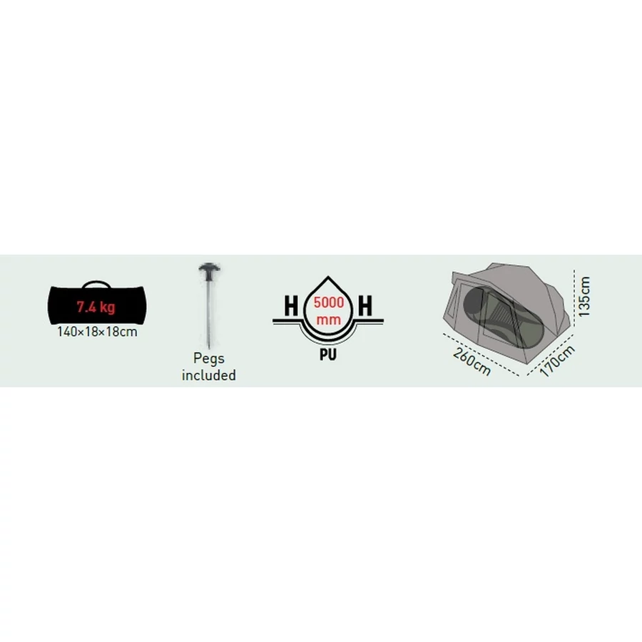Praktikus félsátor, 1-2 napos horgásztúrákra, illetve éjszakai horgászatra. A félsátor anyaga 5000 mm-ig (vízoszlop) vízálló, így egy komolyabb esőzésnek és szélnek is ellenáll. Váza alumínium, könnyű és tartós. Kényelmesen felállítható. A készlet tartalmazza a levehető strapabíró aljat és a leszúró cövekeket is.