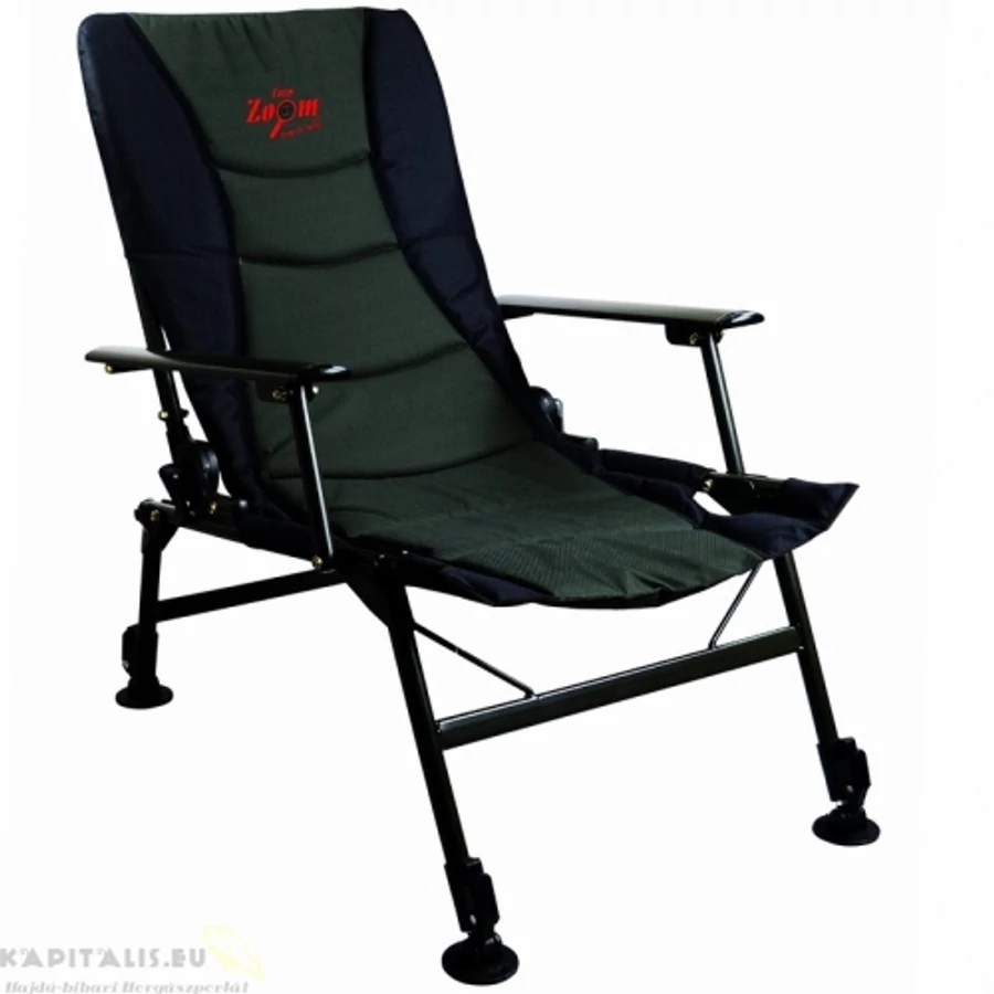 Extra könnyű, masszív fém szerkezettel megerősített karfás fotel. Extrán párnázott ülőfelületű fotel hosszabb horgászatok során is kényelmes ülést biztosít. Krokodil fogas oldalrögztőkkel szabályozhatjuk a háttámla dőlését, közel vízszintes helyzetbe állítható. Mind a 4 lába mocsártalpakkal szerelt és külön teleszkóppal állítható, így akár 15cm-es szintkülönbség kiküszöbölhető. Nincs az a göröngyös felület, ahol ez a fotel ne biztosítana kényelmes ülést. A lábak az egyenetlen talajon való elhelyezéskor szintezésre, és nem a szék vagy ágy ülő illetve fekvő magasság emelésére szolgálnak. Ebben az esetben a kihúzott lábak miatt a terhelhetőség csökken.