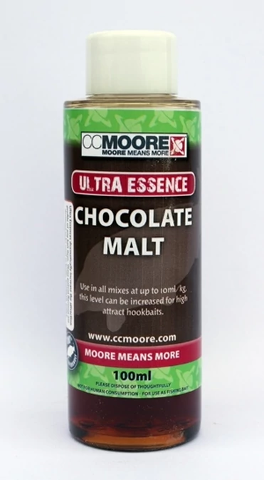 Az Ultra Chocolate Malt Essence egy rendkívül kellemes, fantasztikus illattal és ízzel rendelkező édes csokoládés aroma, egy enyhe élesztős háttérrel. Legendás hírű pontyhorgászok körében az egyik legközkedveltebb aroma. A szigetország és Európa számos nagy vizein már sokszorosan bizonyított. Ideális választás a hosszabb távú horgászatok során. Csalogató hatását legjobban önállóan alkalmazva madáreledeles, tejproteines bojlimixekben fejti ki. Minden esetben a felvert tojásokhoz adagoljuk. Talin, édesítő folyadékkal együtt alkalmazva vonzereje többszörösen megnövelhető. Egész évben kiemelkedő eredménységgel használható. Kiváló alternatívát kínál a kizárólag növényi összetevőket, szénhidrátokat tartalmazó keverékekben. A gyártó által előírt adagolás: max.12ml/kg. Kapástalan időszakokban egy igazi favorit.