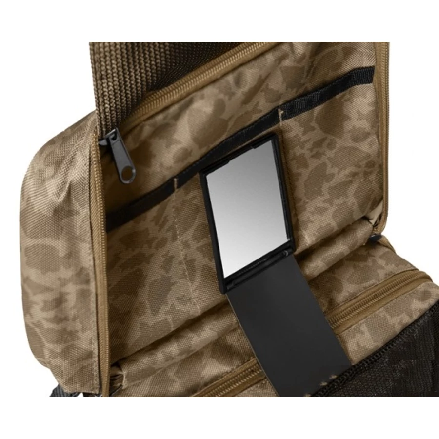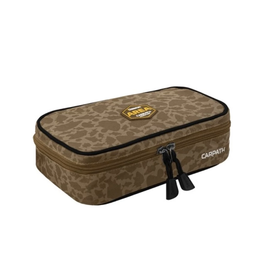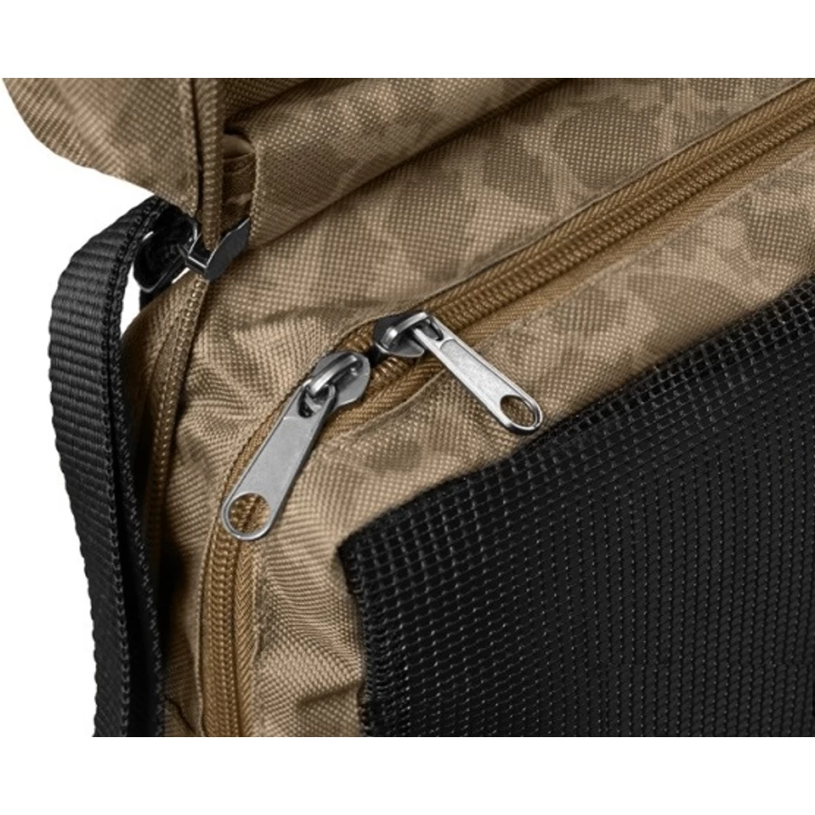 A táska minőségi cipzárral van felszerelve. A külső cipzár műanyag húzózsinórral van felszerelve, amely a végén kibővül, így könnyen megfogható és a táska gyorsan kinyitható. A táska kialakítása kiegészíti az egyedi barna CARPATH terepminta ponty sziluettekkel.