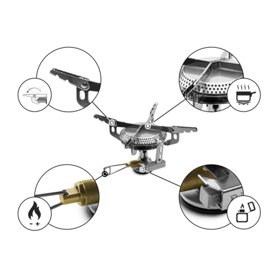 A Delphin FLAMER egy gáz tűzhely amit a kompaktság, könnyű szállíthatóság és magas teljesítmény jellemez. Tökéletes választás bármilyen vízparti tartózkodáshoz, túrázáshoz, kempingezéshez vagy egyéb szabadtéri tevékenységekhez. Méreteinek és kis súlyának (180g) köszönhetően bármikor könnyen magával viheti és szükség esetén könnyedén felmelegíthet vagy elkészíthet rajta bármilyen ételt.