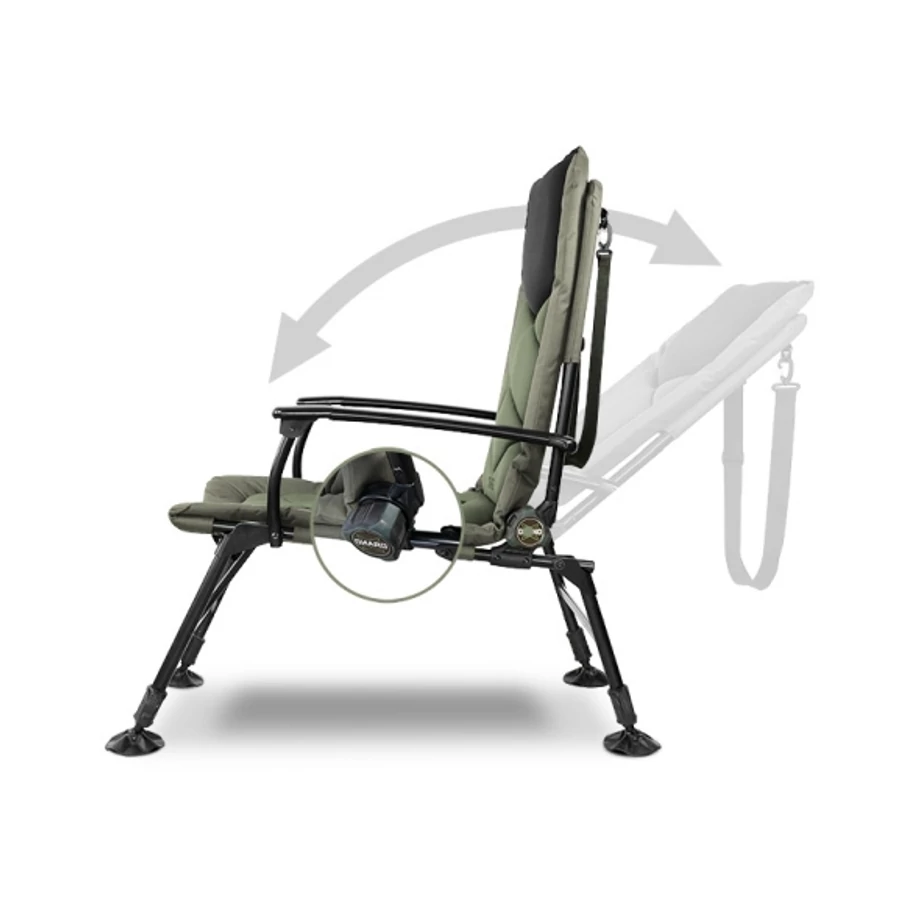 A szék lábainak magassága egy karos szerkezettel beállítható, így nehéz körülmények között is alkalmazkodhatunk az egyenetlen terepviszonyokhoz horgászat során. A szék helyzetét stabil forgólábak is biztosítják, amelyek nagy felülettel rendelkeznek, hogy a lábak ne tudjanak belesüllyedni a nedves talajba a vízparton.