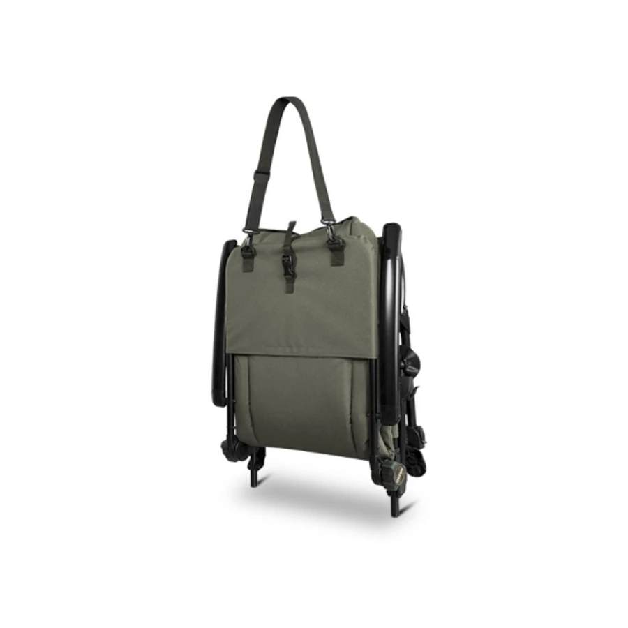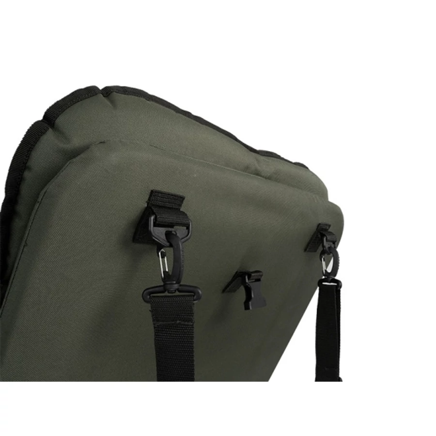 A robusztus, hegesztett acélszerkezet szilárdságot, a széles szögben állítható lábak pedig nagy stabilitást biztosítanak, amit a nagyobb súlyú horgászok különösen értékelni fognak. Masszív felépítése ellenére a szék viszonylag könnyű. Az egyszerű szállítás érdekében a szék levehető hevederrel van felszerelve, amely vállra akasztható, így szállítás közben kezeink felszabadulnak a többi horgászfelszerelésünk számára. Ezenkívül a szék egy műanyag klipsszel is rendelkezik, amely rögzíti a szék helyzetét szállítás közben, és megakadályozza annak nem kívánt kinyílását.