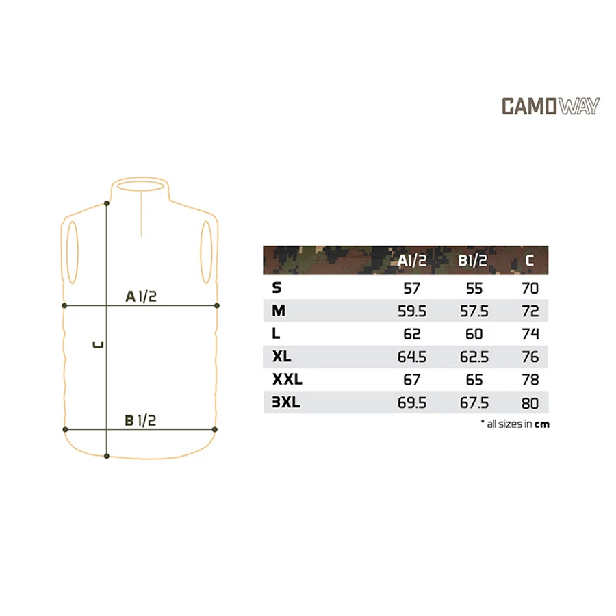 A kabát zárása kiváló minőségű cipzárral van megoldva, amely kívülről szövetcsíkkal borított, hogy jobban ellenálljon a külső körülményeknek. Mindkét oldalon kellően nagy zsebek találhatók kezeink melegítésére, vagy a szükséges kiegészítők tárolására. A CamoWAY mellény megemelt gallérral rendelkezik, hogy alacsony hőmérsékleten jobb nyak- és tarkófedést biztosítson viselőjének.