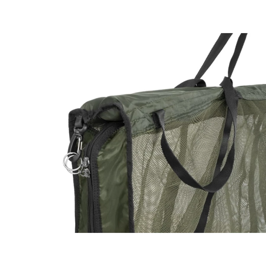 A hálót két fekete textilpánt erősíti meg, amelyek központi fogantyúvá alakulnak át. A hosszú füleknek köszönhetően a táska könnyen mérlegre akasztható. A táska mindkét oldalán textil fogantyúval rendelkezik a könnyű emelés és szállítás érdekében. Erős cipzár található mindkét oldalon és a tetején, így a CWS teljesen kicipzározható a halak könnyebb kezelése érdekében.