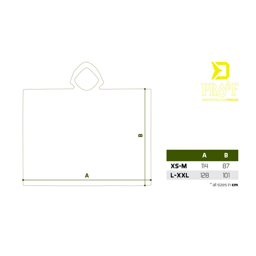 A PROOF Poncho egy húzózsinórral ellátott kapucnival is rendelkezik, amely az Ön igényei szerint állítható. A mellkason és az oldalakon patentok találhatók, melyek nyitott állapotban megkönnyítik a poncsó felvételét, zárva pedig biztosítják a teljes vízállóságot.