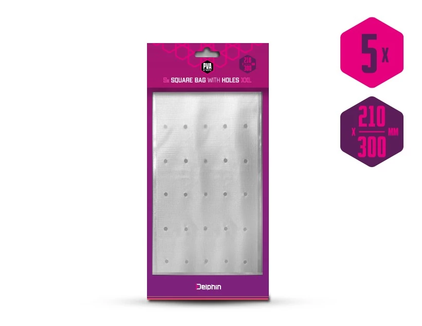 A szlovákiai Delphin gyártmányú, extra nagy méretű, négyszögletes, vízben oldódó tasak háló a pelletből, bojlilból, kukoricából vagy más partikelből álló száraz csalikeverék elhelyezésére szolgál. A tasakok széles körben használhatók pl. ponty, harcsa, amur stb. horgászathoz... A tasakba csomagolt csali a horgászhelyen a fogós csali mellé kerül elhelyezésre. A PVA tasak a vízhőmérséklettel egyenes arányban feloldódik, és a csali közelében kioldja az etetőkeveréket, amivel a horgászott halak számára jelentősen növeli annak vonzerejét. Extra nagy méretének köszönhetően az etetés helyére jóval nagyobb mennyiségű etetőanyag helyezhető el, mint a szokásos méretű tasakok esetében. A tasakok maximális kapacitása 1,5 kilogramm csali, aminek köszönhetően az adott horgászhelyek masszív és pontos beetetésére hivatottak! Ez jelentősen növeli a kapitális hal odavonzásának esélyét!