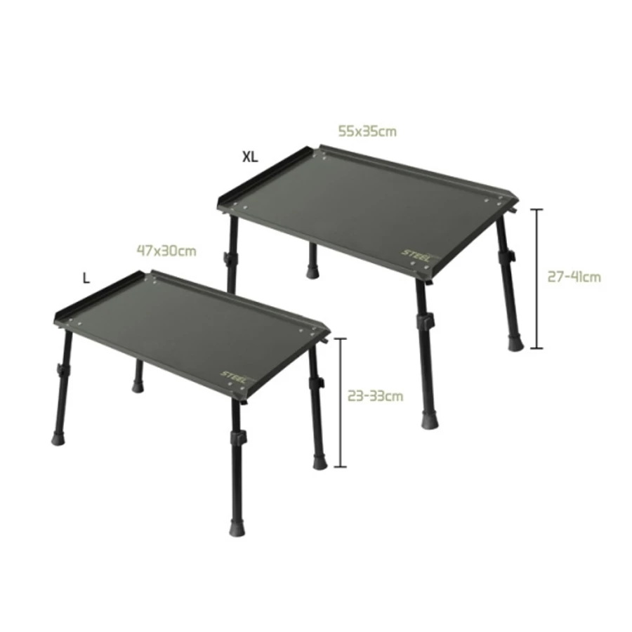 A tartós és praktikus STEELS asztal használható előke kötéshez, valamint reggeli kávéhoz a sátorban vagy az esti grillezéshez. Az asztal fém munkalap 47x30 cm (L változat) vagy 55x35cm (XL változat). Az asztal sarkai nyitva vannak a jobb vízelvezetéshez, ha az asztalt véletlenül a sátor előtt felejti az esőben. A STEELS robusztus teleszkópos lábakkal rendelkezik. Az asztal állítható magassága 23-33 cm (L változat) vagy 27-41 cm (XL változat). A lábak egy speciális mechanizmussal zárhatók, hogy megakadályozzák a nem kívánt összeomlását. A lábak gumírozottak. Az asztalhoz hordtáska tartozik.