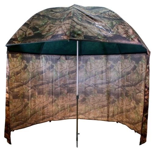 Az oldalsátras ernyő kiváló menedéket nyújt a rövid idejű vízközeli tartózkodásokhoz. Nap, harmat és eső elleni védelemre szolgál. A kupola és az oldalfal nejlonból készül PVC fedőréteggel, amely az ernyő sokkal nagyobb fokú vízállóságát eredményezi. Az ernyő varratai a vízállóság biztosítása érdekében vízálló szalaggal vannak átragasztva. Az oldalsó meghosszabbított fal kupolához történő rögzítésére cipzár szolgál. Az oldalfal alsó részén található tartók a földhöz való rögzítésre szolgálnak biztosító csapok segítségével (a csomagolás részét képezik). A cipzárak a vízállóságuk biztosítása érdekében anyaggal vannak befedve. Az ernyő magassága és a kupola dőlésszöge állítható.Álcázó színkivitel.