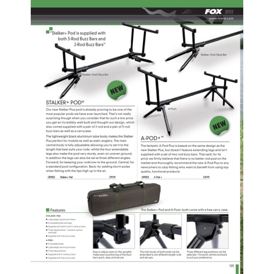 A Stalker Pod Plus népszerűsége fantasztikus növekedésen ment keresztül, mióta bevezettük a piacra, így mára a legnépszerűbb rod podjaink egyike. A könnyű fekete alumínium test teszi tökéletessé, mind a statikus, mind pedig a cserkélő horgászatra. A középső test hosszúságát könnyedén a botok hosszához állíthatja, miközben a kihúzható lábaknak köszönhetően rendkívüli stabilitást kap. A lábak ezen felül három különböző helyzetben használhatók. Előre; a bottartó így közel marad a földhöz. Középen; standard beállításhoz. Hátrafelé; hosszabb leszúrók segítségével a botok spiccét az ég felé állíthatjuk.