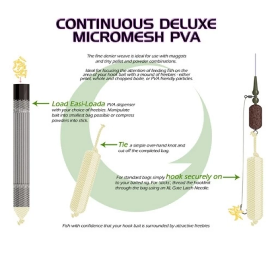 A Micromesh egy különleges, jelenleg a piacon kapható egyik legjobb ár és érték aránnyal rendelkező PVA háló rendszer. Ez a PVA háló szuper erős, kiváló minőségű, és a lehető legpontosabb koncentrált etetést teszi lehetővé. Még a leghidegebb vízben is tökéletesen és pillanatok alatt oldódik. Szövésének köszönhetően, nem csak bojlik hanem a kisebb, micro méretű pelletek, por alapú etetőanyagok és stick mixek használatánál is kiválóan alkalmazható. A „behordásos” és a partról való dobások során is egyaránt használható. A Gardner Tackle eladási statisztikái alapján megállapítható, hogy mind a mai napig a horgászok első számú választása.