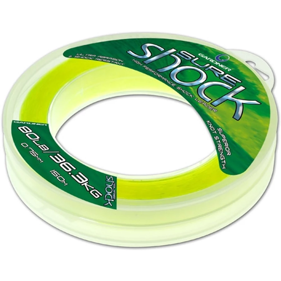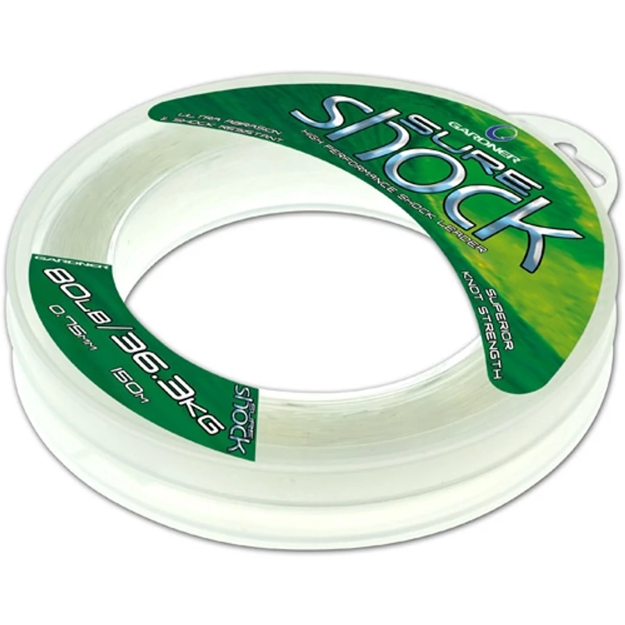 A Sure Shock előtétzsinórt a Gardner Tackle a legextrémebb helyekre, és körülményekre fejlesztette ki. A nagy teljesítményű Co-Polymer előtétzsinór a különleges gyártási technológiának köszönhetően kapott egy szilikon bevonatot is, amelynek akkor van jelentősége igazán, amikor a zsinór a legnagyobb terhelhetőséget kapja, hisz ezzel kimagaslóan megnövelték a kopásállóságát. A könnyen kezelhető és jól köthető verhetetlen Sure Shock hihetetlen szakítóerővel rendelkezik, amely még a legelképesztőbb szituációkban is teljes magabiztosságot ad. Gazdaságos kiszerelésben, széles méretválasztékban, és három, a legnépszerűbb színben (átlátszó, neon sárga, neon narancs) kerül forgalomba, amelyek közül a diszkrét neon színek az éjszakai horgászatok során lehetnek a segítségünkre, illetve nagyon hasznosak az erős nappali fényviszonyoknál is. Ideális választás töklevelekkel, vízzel elárasztott fás, bokros, tuskós helyeken. Mivel szilikonkezelt, megnöveli a dobótávot.