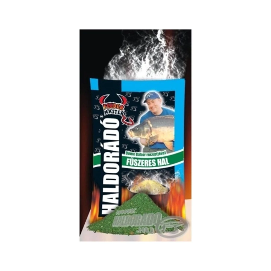 A széria talán legfeltűnőbb színezetű és aromájú tagja a FŰSZERES HAL. A zacskót kibontva a Haldorádó etetőanyagok között szokatlanul „egyszerűnek” tűnő keveréket láthatunk. Az élénkzöld színű, kellemetlenül büdös, fűszeres, hallisztes, finom szemcseméretű keverékből fluo morzsa, repce és apró pellet bújik elő. Csak ennyi? Nem kell megijedni, most sem hagytunk ki belőle semmit! Az etetőanyag 18 különböző (a szám nem elírás!), precízen adagolt alkotóelemből áll!!! De, hol vannak ezek? Benne az anyagban! De miért nem látszódnak? Máris eláruljuk! Az etetőanyag a leghíresebb angol gyártók titkos és költséges gyártástechnológiájával készült. A komplett keveréket pelletizáljuk, majd finom szemcseméretűre őrüljük. Azért van szükség erre a plusz munkafolyamatra, mert a pelletizálás során nagy nyomáson összepréseljük a masszát. A présgépben felmelegedik - de nem fő meg - az alapmix, ez pont elegendő ahhoz, hogy a keverék lelkét adó magas fehérjetartalmú összetevők előemésztett és feltárt formában kerüljenek a hal elé. Hogy még érthetőbb legyen, mindenki tudja, hogy a felpucolt csirkéből finom sült csirke lesz, de mennyivel finomabb az sütve, mint nyersen?! A halak ugyanúgy különbséget tudnak tenni a nyers és főtt csalogatóanyagok között. Nem véletlenül fogósabb a főtt csemegekukorica, mint a száraz takarmánykukorica. A présgépből kinyomott granulátumot (pelletet) finomra őröljük, így tökéletesen azonos lesz a szemcsemérete. A jól tapadó anyag így ráadásul egyenletesen és gyorsan oldódik, miközben megfesti a vizet. Szóval a bonyolultnak és értelmetlennek tűnő gyártási folyamat végére egy olyan anyagot kapunk, amelyért megőrülnek a halak. Ez a keverék remekül illik a modern method feederkosaras technikához is.