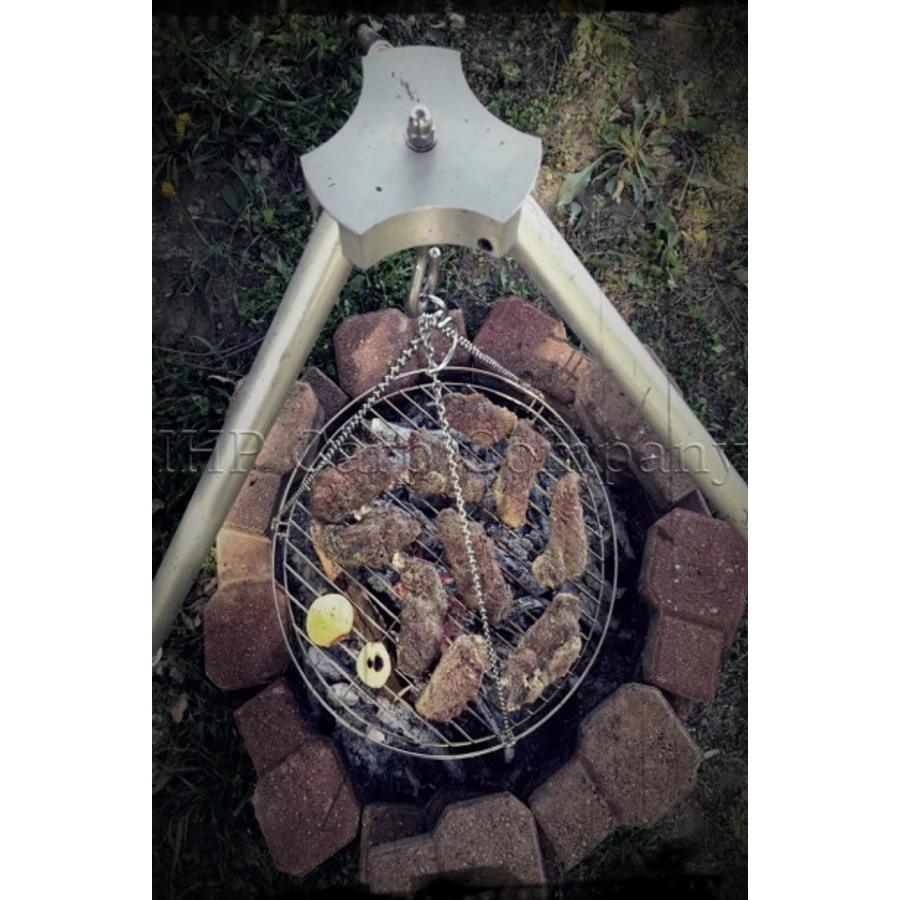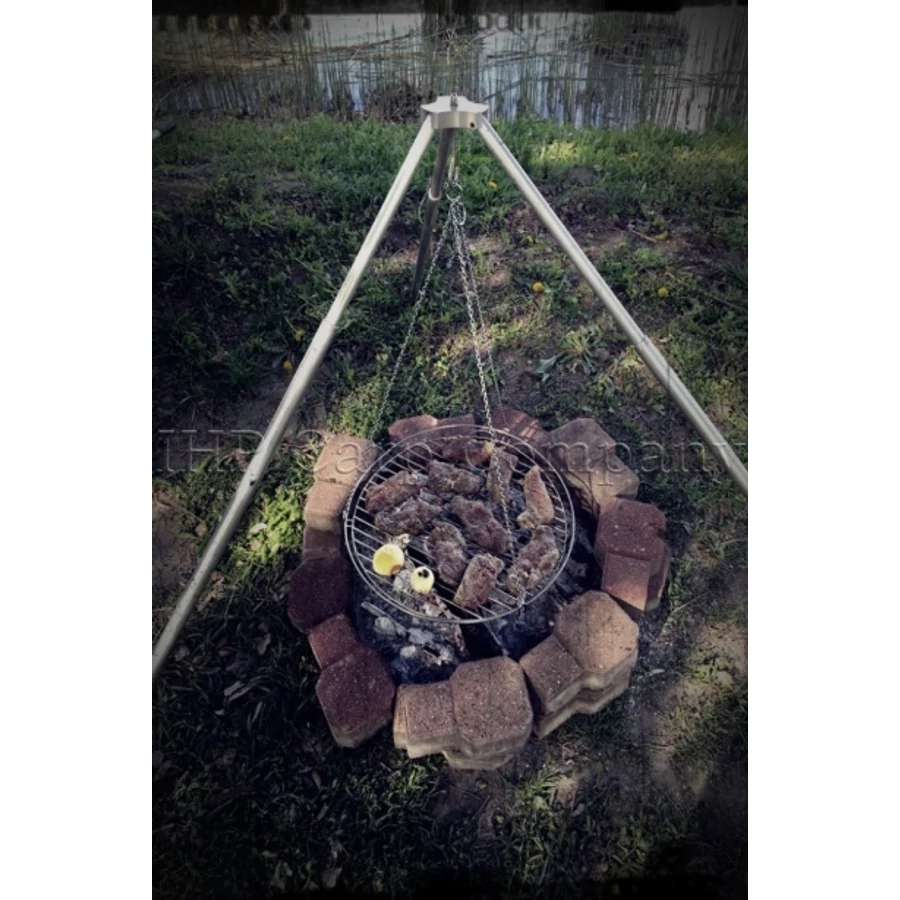 Anyaga: grillrács – rozsdamentes acél, lánc szett – felületkezelt acél Mérete: grillrács átmérő – 50cm, magassága kifeszített lánc szettel (grillrács aljától akasztóig mérve) – 70cm Súlya: 1205g