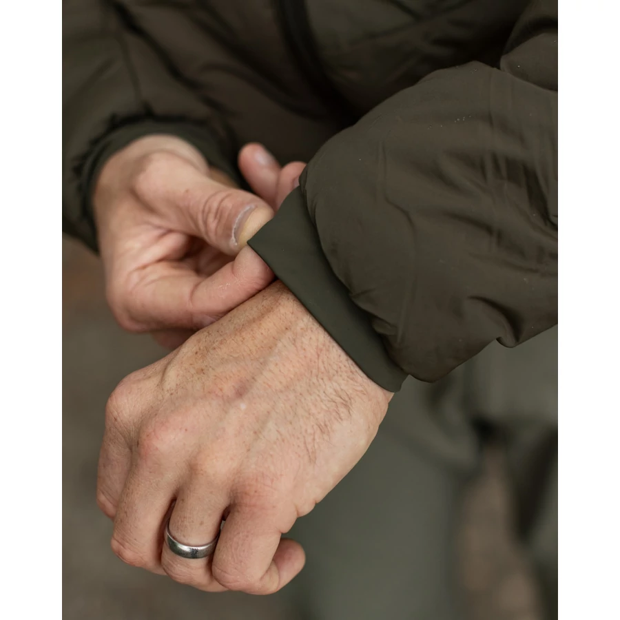 A Korda Insulated Hooded Jacket | Dark Olive S-XXL - kapucnis izolált dzseki S-XXL-es méretekben, egy kabát meghosszabbított hátsó panellel rendelkezik, amely további védelmet nyújt, hogy megvédje a hát alsó részét a hideg levegőtől, amikor hajol vagy nyújtózkodik.