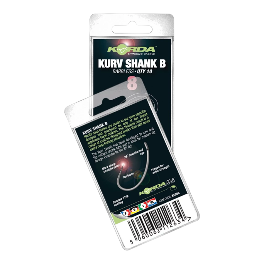 A Korda Kurv Shank B Size 1/2/4/6 - szakáll nélküli pontyozó horog 1,2,4,6-es méretben, mely egy könnyen befelé görbített horog, hosszú és ultra éles heggyel. Ideális a Danny Fairbrass IQ D-Righez és sok féle más pop-up és süllyedő csali szerelékhez. Ez a horog nem tükröződő teflon bevonattal érkezik.