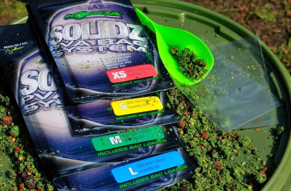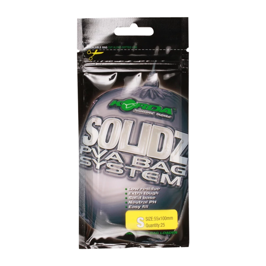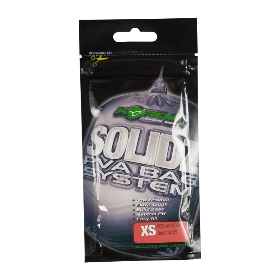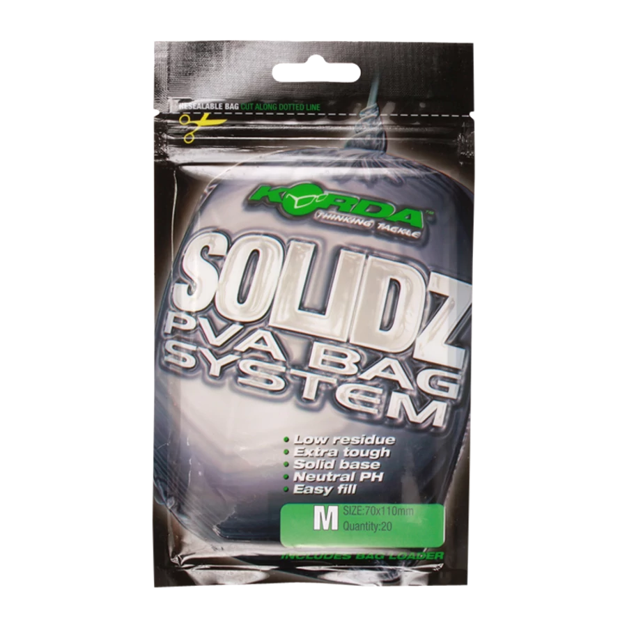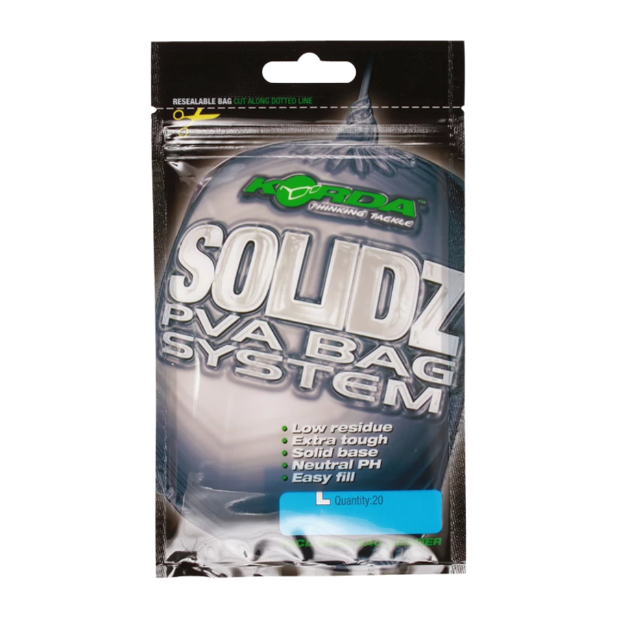 A Korda Solidz PVA Bags - PVA tasak , úgy lettek tervezve, hogy a horgászati technikát minden körülményre és távolságra megkönnyebbítsék. A PVA zacskó használat nagyon kedvelt metódus ahhoz, hogy egy kompakt etetőanyag mennyiséget közvetlenül a horogcsalinál horgászunk. Ezek a zacskók csúcsminőségű japán PVA fóliából egy speciális eljárással készülnek. A Solidzek egy újra zárható csomagolásban érkeznek, amelyikben benne van egy egyszerű használati utasítás és egy Korda Bag Loader (kislapát). Kapható 4 külömbőző méretben minden szituációhoz - mindegyik méretének egy saját színe van, az egyszerű megkülönböztetéshez.