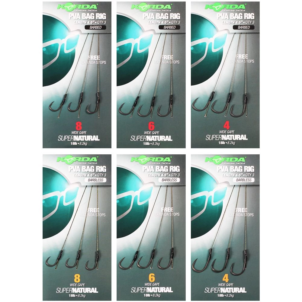 A Korda Solidz PVA Rig Size 4/6/8 Wide Gape 18lb Barbed/Barbless - szakállal vagy szakáll nélküli előkötött horog 4-es 6-os 8-as méretben PVA zacskóhoz, melyek nagyon megbízható Wide Gape horgokkal és 18 lb Supernatural Braid Weedy Greenben 4,5 incs hosszban (kb.10 cm) készülnek. Így ezek az előkék a legjobb választás a PVA zacskókhoz. A rővidsége miatt nagyon jól akad és a szilikon a horog fülön még besegíti, hogy jól forduljon és ezzel jól akadjon a hal szájában.