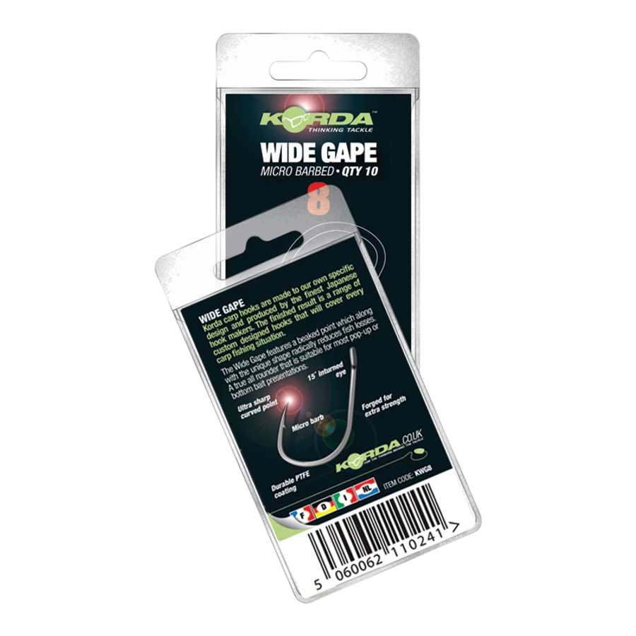 A Korda Wide Gape Hook - mikro szakállas pontyozó horog egy tű éles cső formájú hegye van egy mikró szakállal, hogy minden megakasztott halat megfogjon. A fül 15 fokkal befelé van görbítve, így a horog tökéletes a pop-up és a süllyedő csalik felkínálásához. Egy igazi, teflon bevonatú klasszikus!