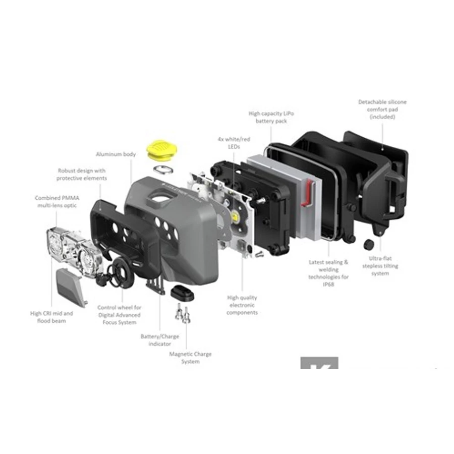 A HF6R Work vékony Ledlenser fejlámpa rendszeres ipari és kereskedelmi alkalmazásokhoz. Kiváló minőségű alumínium házzal, három fényerősséggel és piros elülső lámpával rendelkezik, ezen kívül a közeli munkavégzéshez magas a színvisszaadási indexe. A szabadalmaztatás alatt álló Digital Advanced Focus System látszólag fokozatmentes fókuszálást tesz lehetővé és intuitív módon használható a Focus Wheel segítségével. Az elülső védőelemek nagy ütésállóságot kölcsönöznek a lámpának. A nagy teljesítményű akkumulátornak köszönhetően a HF6R Work akár nyolc órán keresztül is használható közepes intenzitáson. További hasznos funkciói közé tartozik a fali tartó, valamint a sisakra való különböző rögzítési lehetőségek.