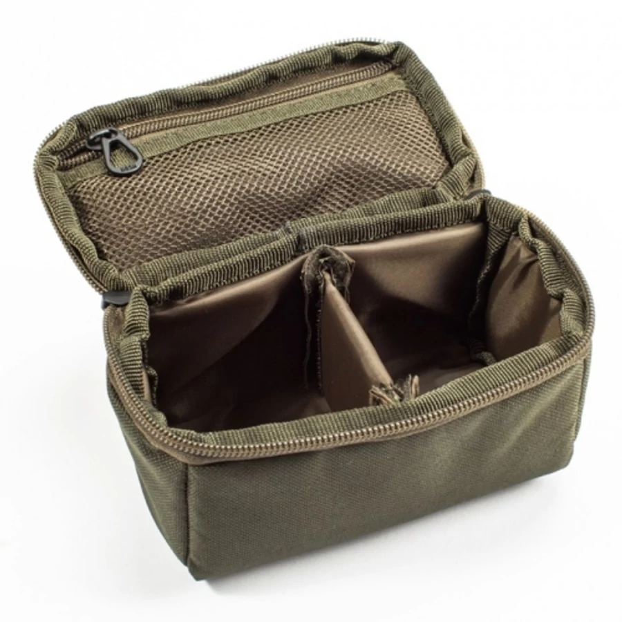 Háromoldalú cipzáras tetejű, párnázott táska, kivehető középső elválasztóval. Kettő small pouch tárolható benne. Belső, cipzáras hálós zseb a fedélen.