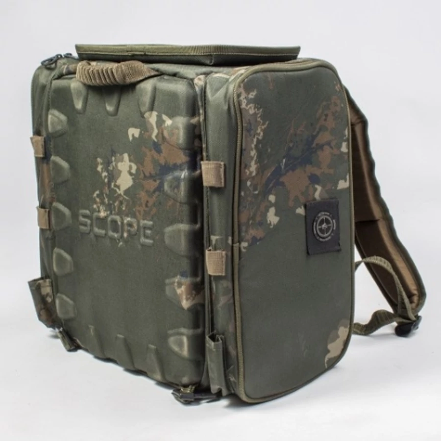 Kompakt sztár a táskák között - egyben táska, bottartó és még asztal is.A megszokotthoz képest a másik oldalon lehet kinyitni cipzár segítségével, így férünk hozzá a fő rekeszhez, amiben hálós zsebek vannak az értékeidnek, valamint két teljes méretű oldalsó rekesszel rendelkezik. Klasszikus Scope tartozék a mágneses tálca. Az állítható és párnázott vállpántok úgy alakíthatóak, hogy abból egy asztalt tudjunk készíteni a tálca segítségével, hogy a horogcsalik, csalizóeszközök vagy az előkék mindig kéznél legyenek. Alternatív megoldásként a tálca a hátizsák tetejére is tehető, amikor az nincs kihajtogatva. A leszúrótartó zsebek és hurkok segítségével bottartóként is használható betonon vagy nagyon kemény talajon.