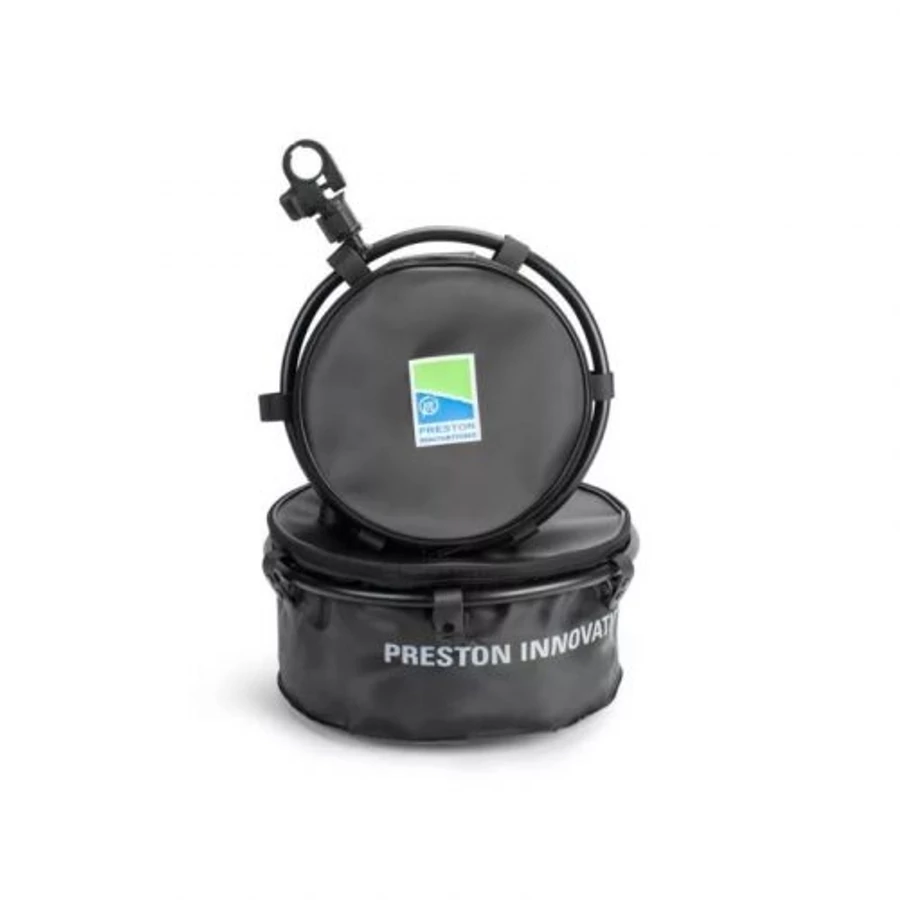 Vízálló, zárható etetőanyag tároló EVA anyagból készült edény adapterrel, L-es méretben. Az adapter segítségével bármilyen lábra illeszkedik.