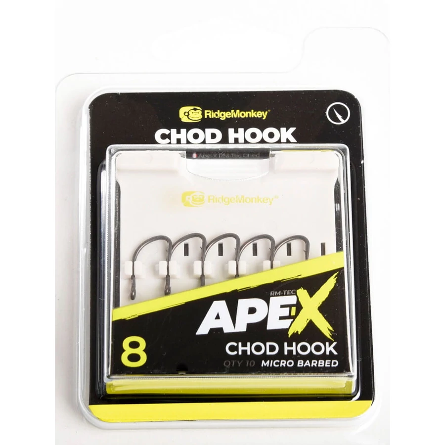 A RidgeMonkey Ape-X Chod Barbed Size 5/6/8 - szakállas horgok 5,6,8-as méretben, a sokéves gyártási és horgászati tapasztalatokat ötvözve, az Ape-X horog sorozat úgy lett tervezve, hogy minden pontyhorgászati és egyéb speciális bojlis szituációt lefedjen.