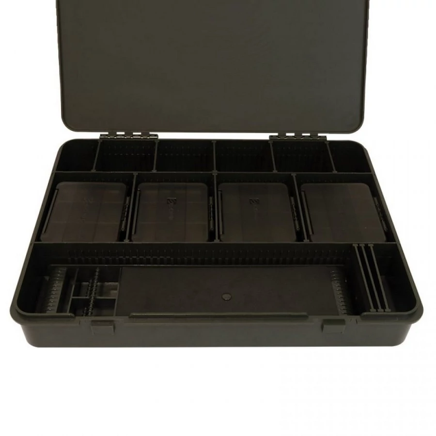 Doboz azoknak a horgászoknak, akik nagyszámú szerelékelemet és szerelékanyagot szeretnek magukkal vinni. A LOKBOX™ LARGE LOADED BOX nyolc belső tárolódobozt tartalmaz (lásd alább), amelyek mindegyike tartalmaz helyet a forgóknak, horgoknak, szerelékgyűrűknek, gyöngyöknek stb. Ezen kívül van egy kétoldalas körbetekerhető szereléktábla és 20 csap is. Tökéletes doboz hosszú külföldi utazásokhoz. A LOKBOX™ termékcsalád minden dobozát Click-Lok biztonságos zárófülekkel tervezték.