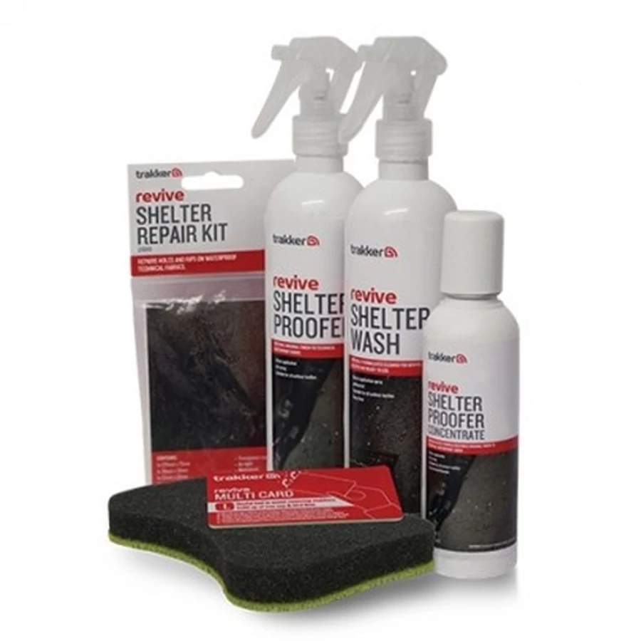 A Revive Shelter Complete Care Kit a Trakker Products nyári újdonsága, amely egy teljes készletben tartalmazza a sátrak és más egyéb szövetanyagok tisztításához, mosásához, impregnálásához valamint a lyukak, repedések javításához szükséges készlet minden elemét.